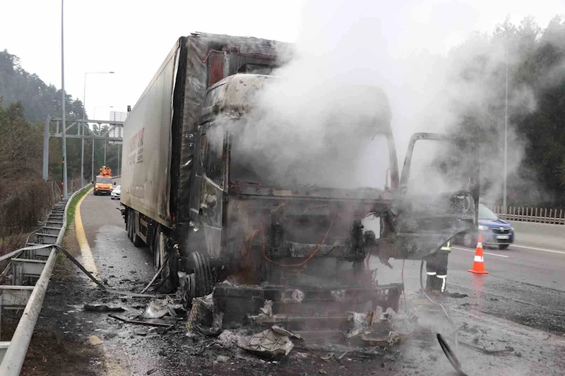 Adana – Pozantı otoyolunda seyir halindeki mandalina yüklü Mercedes Axor marka tırda yangın çıktı. Alevler aracın kupa kısmını tamamen sardı. Tır, kullanılamaz hale geldi.