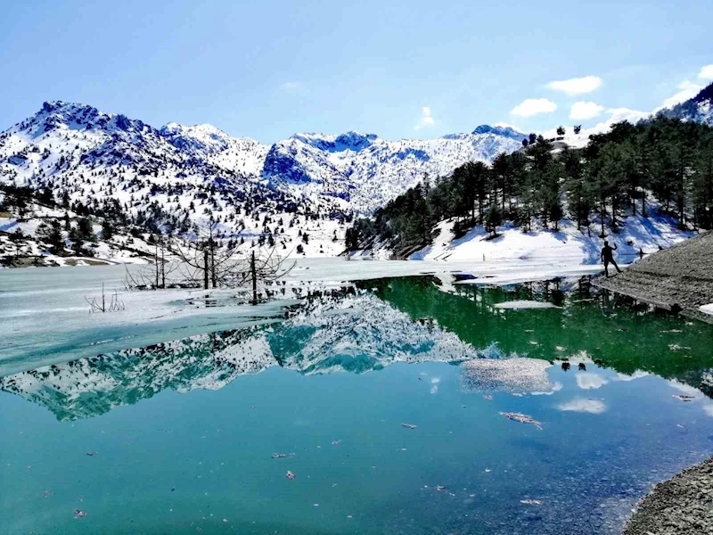Göksun ilçesi Değirmendere Göleti’nin yüzeyi buzla kaplandı. Doğa tutkunları ise eşsiz manzaralarla karşılaştı.