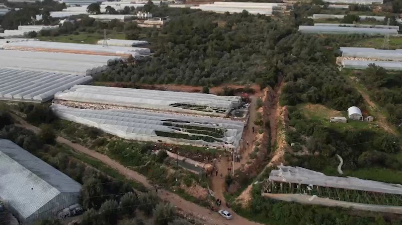 Zarar gören seralar dron ile görüntülenirken, ilçede hasar tespit çalışmalarının devam ettiği kaydedildi.