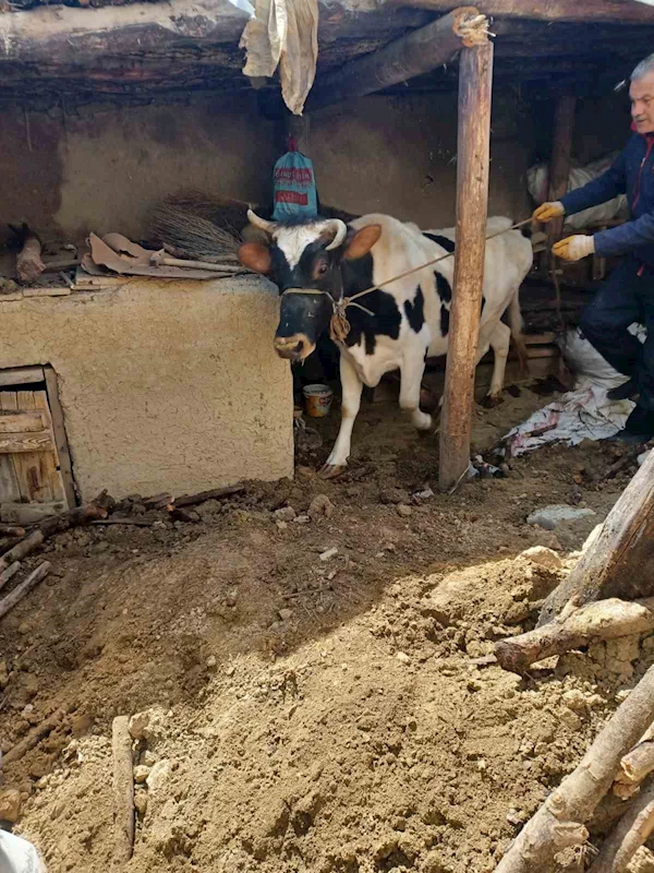 Kahramanmaraş’ta ahırın yıkılması sonucu mahsur kalan inek kurtarıldı.